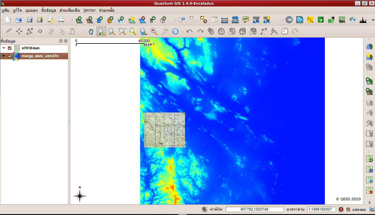 • ผมดาวน์โหลด DEM จาก Aster GDEM ที่ผมเคยถึงไปแล้ว ได้มา 2 ไฟล์คือ ASTGTM_N13E099_dem.tif และ ASTGTM_N14E099_dem.tif ทั้งสองรูปเป็น geographic Lat/Long ผมนำมารวมกันด้วย tool ของ GDAL/OGR คือ gdalwarp เพื่อรวมไฟล์ก่อน แล้ว reproject จากระบบพิกัด geographic WGS84 (EPSG = 4326) ไปเป็น UTM zone 47N (EPSG=32647)
