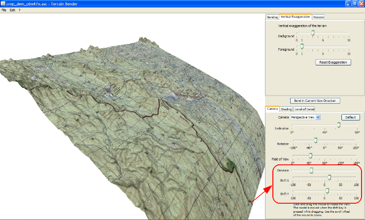 • ลองสวมภาพแผนที่ L7018 ที่เตรียมไว้ด้วยการคลิกที่เมนู File > Open Texture Image… เลือกไฟล์ที่เตรียมไว้ ลองใช้เมาส์หมุน ส่วนการ zoom เลื่อนทำได้โดยการเลื่อนแถบ Distance, Shift X และ Shift Y