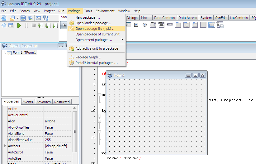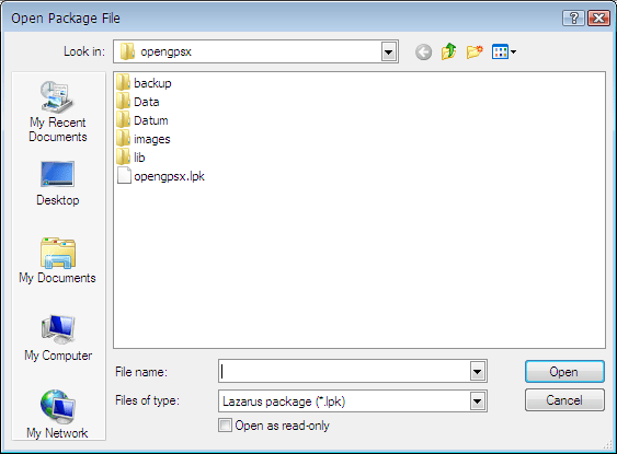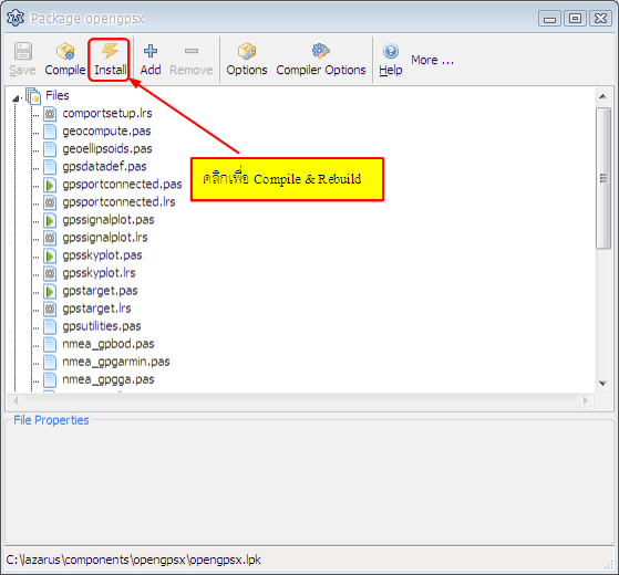 - คลิกที่เมนู Package > Open package file (.lpk)… เปิดไฟล์ opengpsx.lpk ที่อยู่ในโฟลเดอร์ c:\lazarus\components\opengpsx
