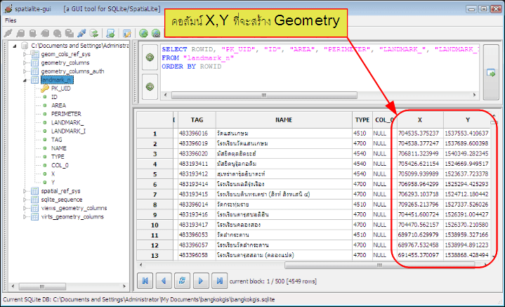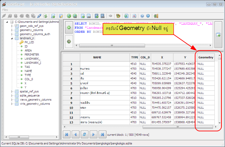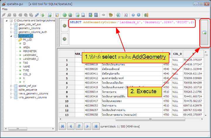 - เราจะสร้าง table ที่เก็บจุดแสดง landmark ด้วยการใช้ข้อมูล X,Y ที่อยู่ในคอลัมน์ที่ผมแสดงไว้ข้างต้น ด้วยการใช้ภาษา SQL ดังบรรทัดด้าน วิธีใช้ copy ไปไว้ที่ช่อง query ของ spatialite ดังรูปด้านล่าง สังเกตว่า 32647 คือ SRID แสดงระบบพิกัดของ UTM Zone 47N บนทรงรี WGS84