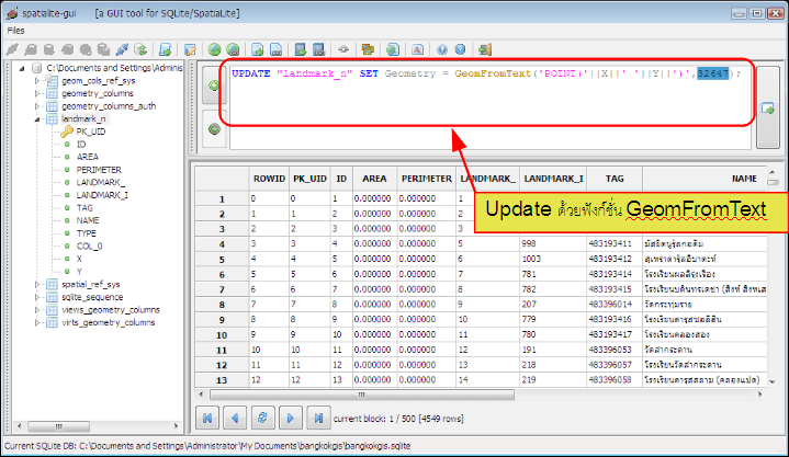 - ต่อไปจะ query ด้วย Update …GeomFromText คัดลอกโค๊ดด้านล่างไปแปะที่ช่อง queryแล้วคลิกที่ Execute SQL statement อธิบายอีกนิดว่าชื่อคอลัมน์ X และ Y เมื่อมาปรากฎในคำสั่งจะถูกหุ้มด้วยเครื่องหมาย || แล้วปิดด้วยเครื่องหมาย quote (‘) ถ้าเกิดคอลัมน์ X และ Y เป็นชื่ออื่นเช่น East และ North ตรงคำสั่ง POINT ก็จะกลายเป็น POINT(‘||EAST||’ ‘||NORTH||’)