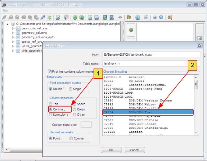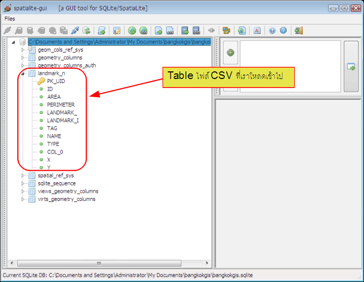 - การสร้างฐานข้อมูล การสร้างตาราง(table) การเพิ่ม ลบ คอลัมน์ สามารถทำได้ใน spatialite-gui ได้หมดทั้งสามารถ query เพื่อสืบค้นด้าน spatial ได้ด้วย เมื่อเปิดโปรแกรมมาแล้ว จะทำการ load csv ที่ผมทำลิงค์ไว้ให้ตอนต้นๆ