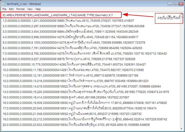 - เขียนเรื่อง spatialite มา 2-3 ตอนแล้ว มาดูในตอนนี้สมมติว่ามี text file ที่เป็นรูปแบบ csv คั่นฟิลด์หรือคอลัมน์ด้วยเครื่องหมายคอมมา (,) ในข้อมูลมีคอลัมน์ค่าพิกัด X และ Y ด้วย เราจะมาแปลงเป็นฐานข้อมูลของ spatialite ซึ่งสามารถ export เป็น shapefile ได้ถ้าต้องการ สนใจดาวน์โหลดข้อมูลมาทดลองได้ตามลิงค์นี้ landmark_n.zip