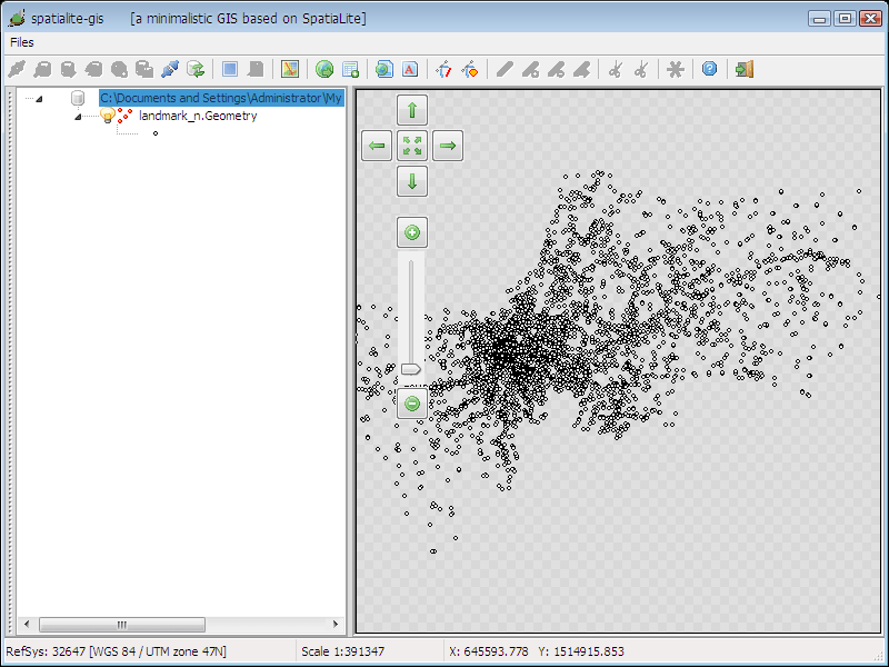 - ตอนนี้เราไม่ทราบว่าฐานข้อมูลเชิงพื้นที่จะมีสภาพเป็นอย่างไร ปิดทูลส์ spatialite-gui แล้วเปิด spatialite-gis เมื่อเปิดมาแล้วทำการ connect ไปที่ฐานข้อมูล “bangkokgis.sqlite” ที่เราสร้างไว้แล้ว ในตอนแรกโปรแกรมจะถามว่าให้สร้าง table เพิ่มหรือปล่าวเช่น table เก็บสัญลักษณ์ symbol ผมเลือก yes ตรงบรรทัดที่สองเพื่อเลือกให้ spatialite-gis สร้างให้อัติโนมัติ จะเห็นการแสดงผลเป็นจุด