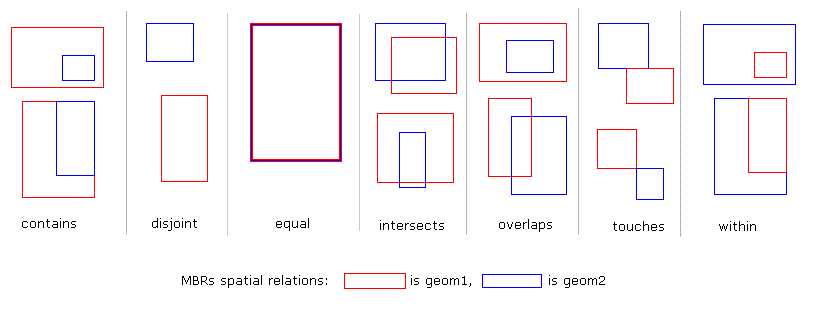- MBR บางครั้งเรียกสั้นๆว่า Bounding Box หรือ Envelope เป็นรูปทรงสี่เหลี่ยมแสดงค่าพิกัดน้อยที่สุดและมากที่สุดแทนรูปทรงเรขาคณิตต่อไปนี้ได้แก่ จุด, เส้น, โพลีกอน เพื่อให้ง่ายและสะดวกในการใช้ฟังก์ชั่นด้านเรขาคณิต เช่นจะหาว่าเส้น polyline สองเส้นตัดกันหรือไม่ ขั้นต้นฟังก์ชั่นจะหาว่า MBR ทับกันหรือไม่ ถ้าไม่ทับกันก็หยุด ถ้าทับกันจะนำ polyline แต่ละ segment มา intersect กับ polyline อีกเส้นว่ามีจุดตัดกันหรือไม่ ซึ่งถ้าใช้ MBR ตรวจสอบก่อนจะทุ่นระยะเวลาได้มาก