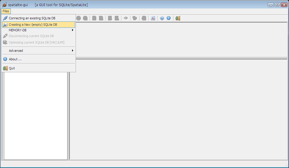 - เมื่อดาวน์โหลดมาแล้ว unzip ดูจะเห็นไฟล์เป็น shape file สองชุด คือไฟล์ landmark_n และ subdist50 เปิดโปรแกรม spatialite-gui สร้างฐานข้อมูลของ spatialite ใหม่ คลิกที่เมนู Files > Create a New (Empty) SQLite DB… จากนั้นเลืิอกโฟลเดอร์ที่จัดเก็บฐานข้อมูลแล้วเซฟชื่อ ผมตั้งชื่อเป็น bangkokgis2.sqlite