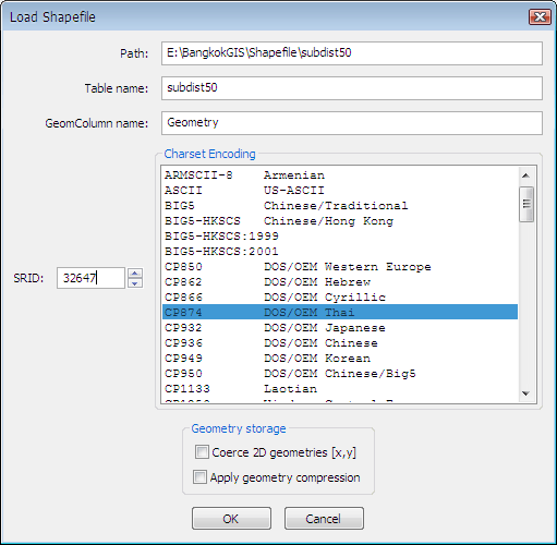 - จากนั้นนำเข้า shapefile ชื่อ landmark_n แล้วตั้งค่า SRID เป็น 32647 และเลือกโค๊ดภาษาไทยเป็น CP874