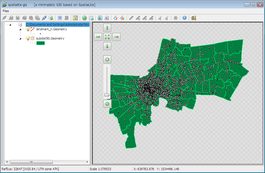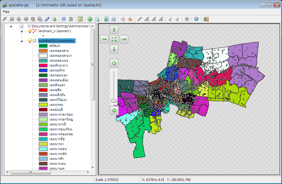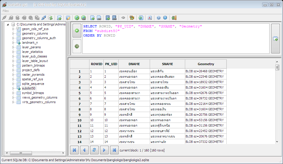 - ปิดโปรแกรม spatialite-gui แล้วเปิด spatialite-gis เปิดฐานข้อมูล bangkokgis2.sqlite จะเห็นผลการแสดงดังรูปด้านล่าง