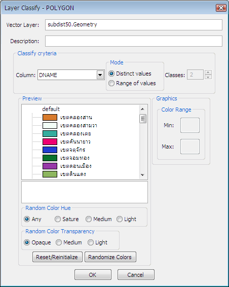 - จัดการแสดงผลตรงเขตกทม.ให้ดูง่ายด้วยการตั้ง layer คลิกขวาที่ subdist50 แล้วเลือกเมนู Layer configuration > Classify ทำการแยกชั้น layer ตามชื่อเขตกทม. ดังรูปด้านล่าง