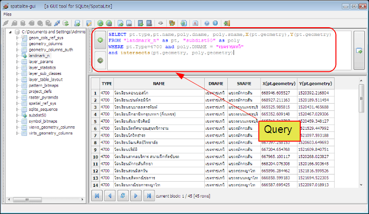- สืบเนื่องจาก syntax ก่อนหน้าคือเรากำหนดเงื่อนไขคือ WHERE pt.Type=4700 and poly.DNAME = “เขตราชเทวี” เมื่อใช้คู่กับ intersects(pt.geometry,poly.geometry) จึงเป็นการหาว่ารูปทรงเรขาคณิต(polygon) ของเขตราชเทวี เมื่อ intersects กับจุด(point) ที่เป็นโรงเรียนทั้งหมดในกทม. จะได้โรงเรียนที่อยู่ในเขตราชเทวีเท่าไหร่ จัดการคัดลอก syntax ด้านบนแล้วมา paste ลงในช่อง sql statement แล้วจัดการคลิก execute จะได้ผลลัพธ์ดังรูปด้านล่าง ซึ่งในตอนนี้ผมค้นได้ทั้งหมด 45 โรง