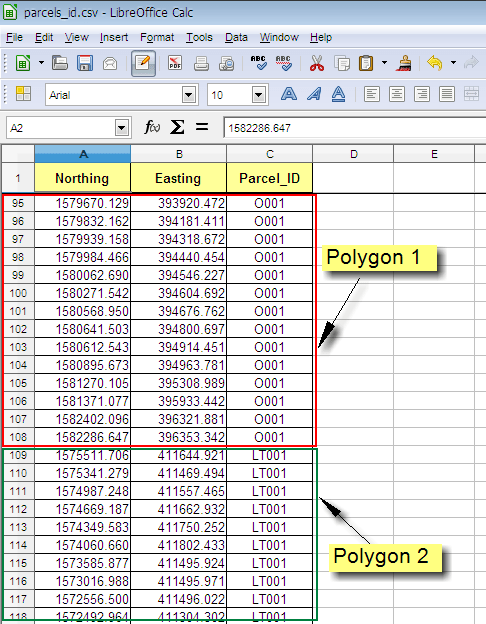 • รวมไฟล์แปลงที่ดินเป็นไฟล์เดียว ถ้าไฟล์แปลงที่ดินเก็บแยกไฟล์กันให้นำมารวมเป็นไฟล์ CSV ไฟล์เดียวจะสะดวกมาก แต่ละวงของ polygon จะต่างกันที่ Parcel_ID