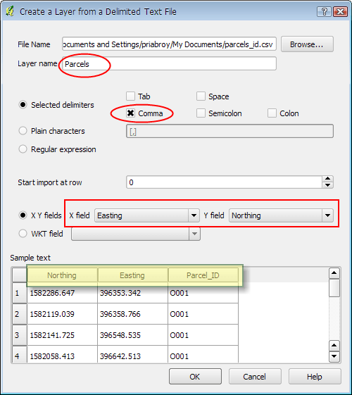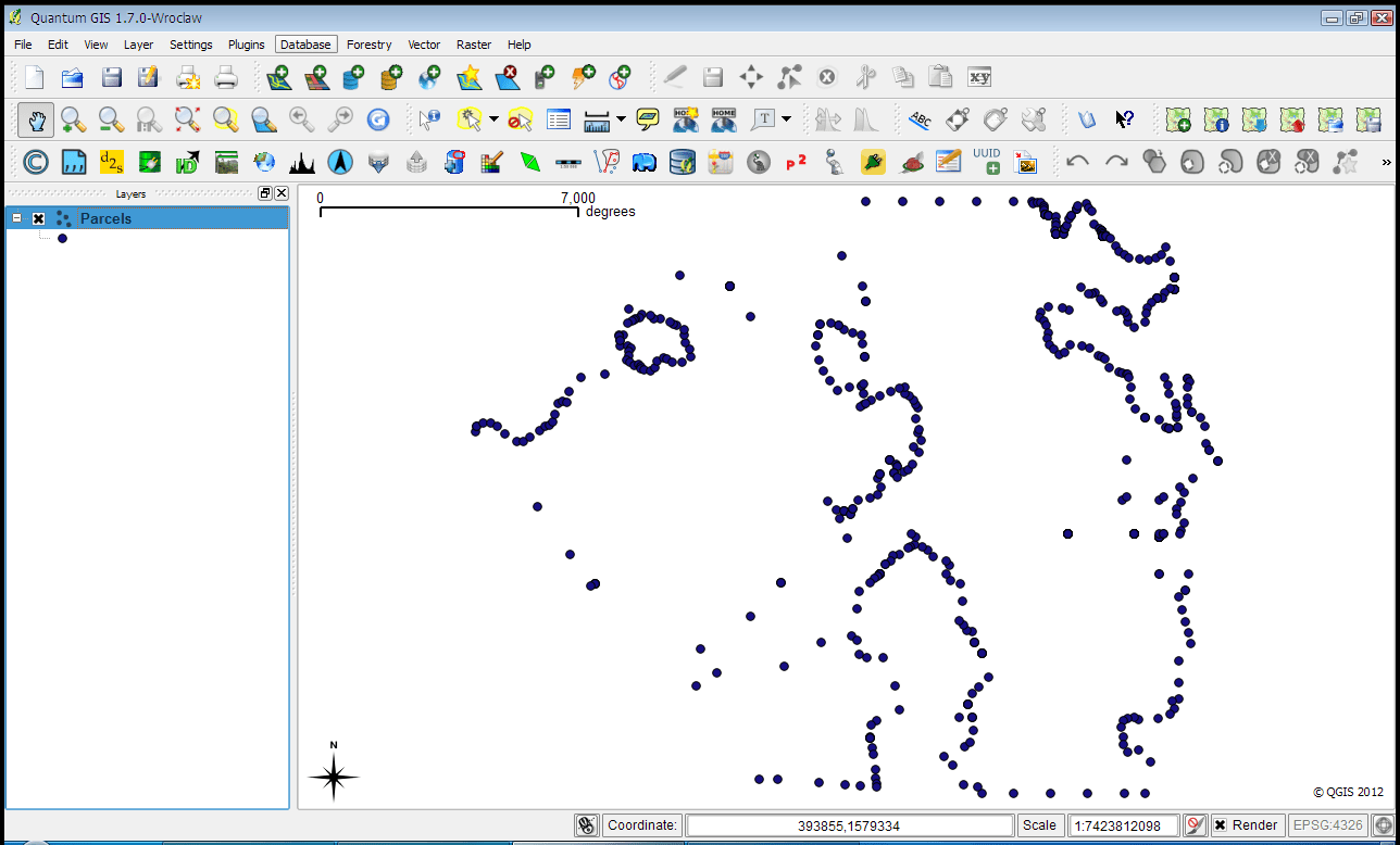 • ใช้ปลั๊กอิน “Add Delimited Text Layer” ทำการอ่านไฟล์ CSV ของเรา ผลลัพธ์จะอยู่ในรูปจุด (Point) แต่ละจุดจะมี Parcel_ID ที่ต่างกัน และในกลุ่มจุดที่ Parcel_ID เดียวกัน QGIS จะสร้าง feather_id ให้ตามลำดับการนำเข้า