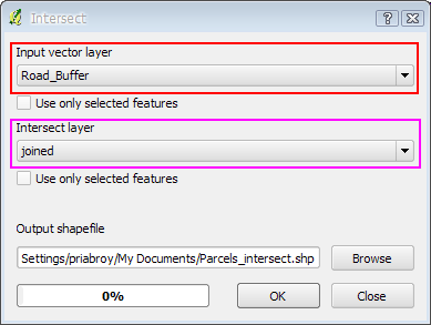 • ต่อไปจะหา polygon แปลงที่ดินที่ถูกตัดด้วยขอบเขตถนน 100 เมตรที่ตัดผ่าน ที่เมนู Vector > Geoprocessing > Intersect ใส่ค่าไปตาม dialog ดังรูปด้านล่าง