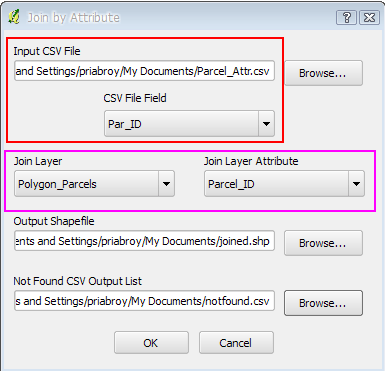 • ใช้ปลั๊กอิน “MMQGIS” ทำการ Joint Attribute ด้วยเมนู Plugins > mmgis > Attributes Join from CSV File… จากไดอะล็อกเลือกไฟล์ (Input CSV File) แล้วกำหนด ID ของไฟล์ที่ CSV File Field ในที่นี้เป็น Par_IDเลือก layer ที่จะนำมา join (Join Layer) ในที่นี้เป็น Polygon_Parcels เลือก Join Layer Attribute ในที่นี้เป็น Parcel_ID เลือก Output Shape File เพื่อเก็บไฟล์ที่ Join Attribute กันแล้ว ส่วน Parcel_ID ไหนหาตัว join ไม่ได้เก็บไว้ในไฟล์ notfound.csv ซึ่งทำให้สามารถตรวจสอบได้ว่า Parcel_ID ที่ไม่สามารถหาคู่กันเจอ