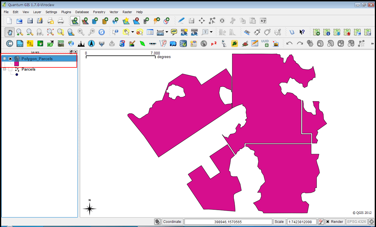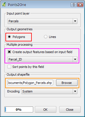 ใช้ปลั๊กอิน “Points2One” ทำการรวมจุดที่มี Parcel_ID เดียวกันเป็น Polygon สืบจากข้อ 2 ปลั๊กอินนี้จะมองหา Parcel_ID เดียวกันแล้วลำดับ feather_id เริ่มลากเส้นจาก feather_id เท่ากับ 1 จนไปสิ้นสุดตัวสุดท้ายแล้วทำการปิดรูปให้