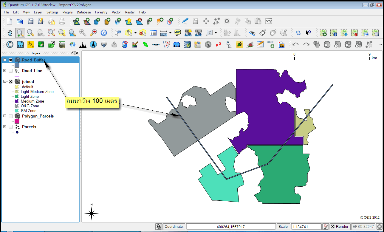 • โจทย์ก็มีว่าถ้ามีแนวถนนกว้างเท่ากับ 100 เมตร (จริงแล้วคือเขตถนนหรือ right of way) ผ่านเข้าไปในแปลงที่ดิน ให้ประมวลผลว่าเข้าไปในแปลงไหนพร้อมแสดงเป็น map