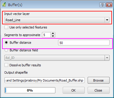 • ต่อไปจะขยายถนนให้ได้ขนาดกว้าง 100 เมตรด้วยการทำ Buffer ด้วยปลั๊กอืน fTools ใช้เมนู Vector > Geoprocessing Tools > Buffer ป้อนค่าใส่ไดอะล็อกดังรูป