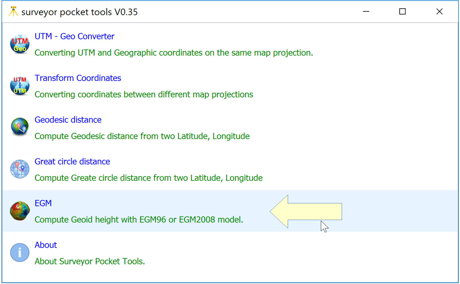 - ผ่านไปแล้วสามโปรแกรมย่อยๆ นี่คือโปรแกรมที่สี่ โปรแกรม EGM คำนวณหาค่า Geoid Separation ไม่ใช่โปรแกรมสุดท้ายนะครับ เพราะ Surveyor Pocket Tools จะเพิ่มโปรแกรมพื้นฐานสำหรับช่างสำรวจต่อไปเรื่อยๆ