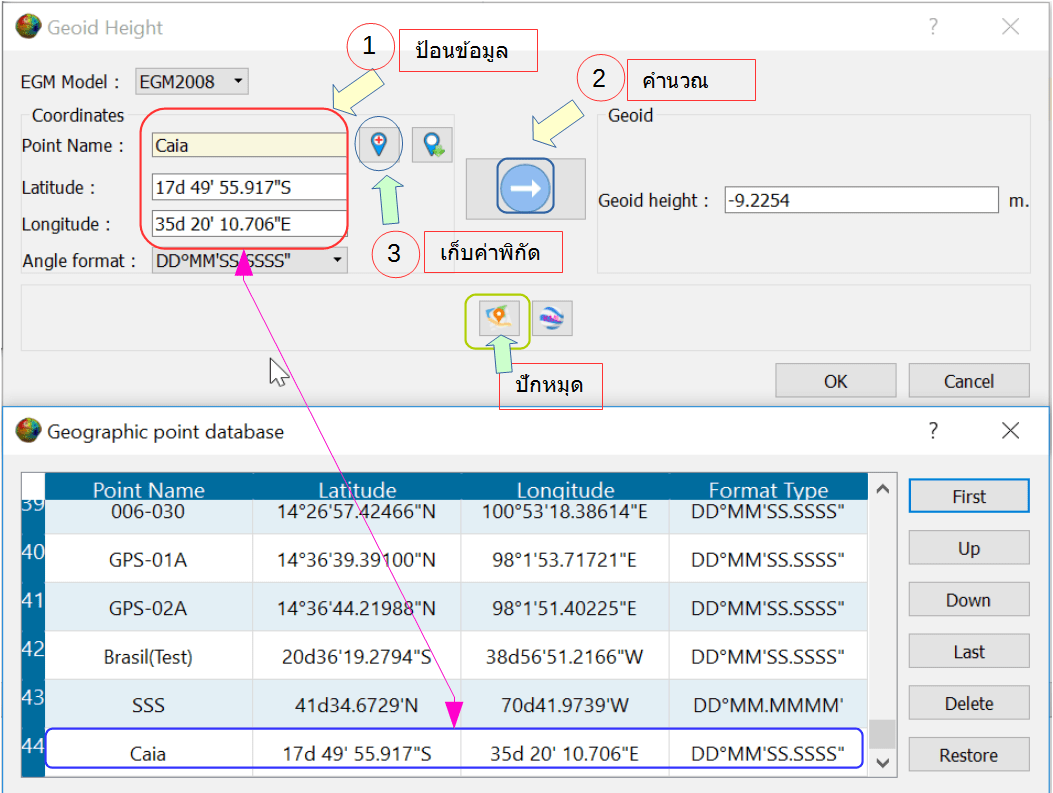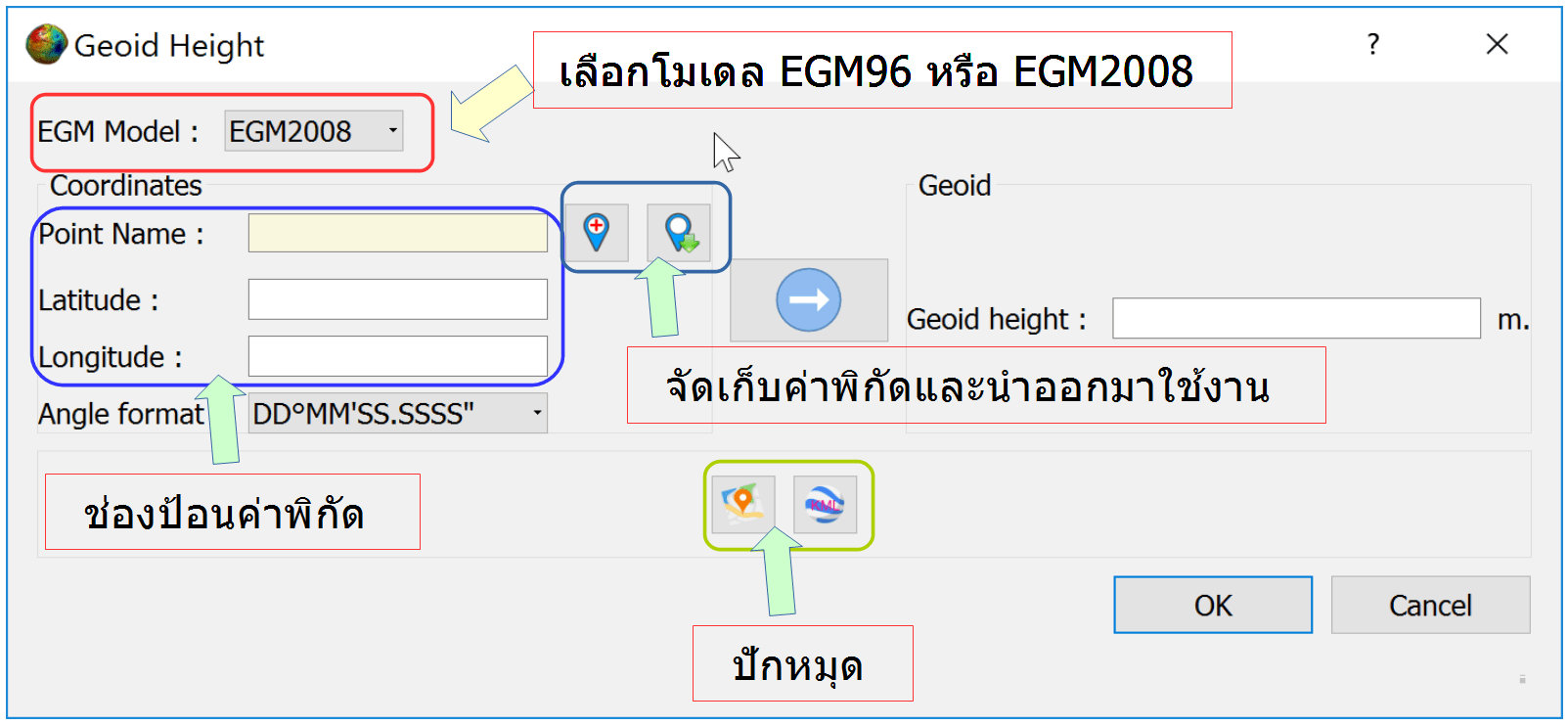 - ลองป้อนจุดดังนี้ ชื่อ “GPS-KBM” Latitude = 14.6109419444 Longitude= 98.0315881139 รูปแบบมุมเป็น degree คลิกที่ไอคอนลูกศรเพืือคำนวณได้ค่า -38.9148 m. บนโมเดล EGM2008